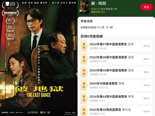 据HKBO统计,《破·地狱》在11月9日正式公映,首周两天便斩获1535万港元,以明显优势击败早一周亮相的《焚城》,轻松登顶票房榜首;若加上10月下旬开启的优先场收益,《破·地狱》的累计数字达到1620万港元。实际上,《破·地狱》还打破一项尘封多年的历史纪录:9号当天,《破·地狱》在全港开出逾千场次并进账861万港元,超过《寒战2》在2016年创下的近756万港元,改写华语电影的单日票房新高。