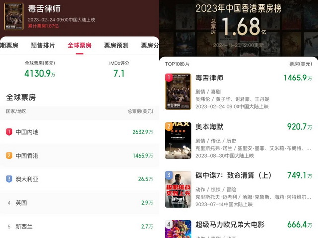 2023年,黄子华迎来个人电影生涯的新高点。自1月23日首映后,《毒舌大状》势如破竹完成四连庄,最终一路续航至1.15亿港元,成为史上首部破亿的港产片。由此《毒舌大状》打入历年十大排行榜,紧随“卡神”巨制《泰坦尼克号》名列第八位,更成为近12年内首部上榜的港产片。目前《破·地狱》的掘金速率甚至快过《毒舌大状》,未来十大排行榜可能再度迎来洗牌。