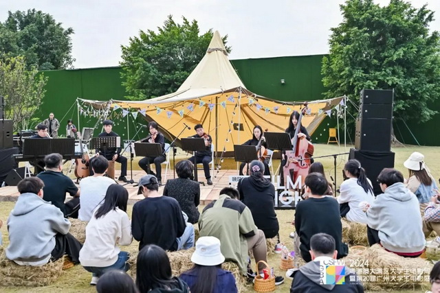 在前天晚上刚刚结束的“晚风 FUN 映”电影之夜上,青年学子走出户外,在广州露营大学城基地大草坪观看了暑期档的高分国漫作品《落凡尘》。与此同时,还有电影文创市集、DIY手作体验、音乐现场演出,学生们可以听着电影主题曲,亲手制作电影周边。