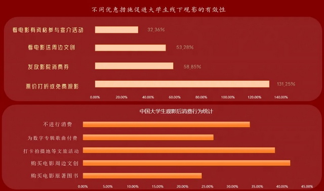 在映前,大学生会对于院线举办的优惠活动有积极的参与意愿,在映后,大学生更是普遍伴随着衍生消费行为,比如购买电影周边文创、打卡拍摄地等文旅活动。让中国电影产业的转化方式不止于票房,大学生或将成为一根关键的杠杆。