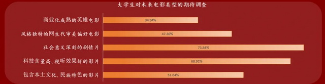 了解了大学生对市场的价值之后,更加需要了解的是,大学生对电影的审美偏好究竟是怎样的。仅从类型上来看,报告显示,大学生对喜剧片最为钟情,选择比例高达68.44%,其次是剧情片与科幻片,分别达到37.84%和35.71%。这样的偏好,与大盘观众基本相近。但报告中最为独创性的结论,是提出了大学生最偏爱的三种类型电影:以“现实主义+商业类型化”为代表的社会意义深刻的剧情片,高科技含量丰富、视听效果震撼的制作大片以及独具东方美学特色、饱含时代文化记忆的影片。反而是网生代审美偏好电影,未能进入大学生的前三选择。