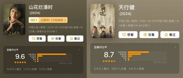 除了热播剧集,今年腾讯视频的多部作品也焕发出了相当可观的长尾效应。《山花烂漫时》开分9.0,如今一路涨至9.6,成为近九年国产剧评分TOP1。《天行健》豆瓣开分8.1,完播至今接近半年,评分一路看涨,前几天已经涨至8.7分。