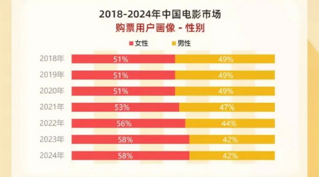 当创作者乐此不疲地偷懒套用之前的创作方法论时,观众群体已经发生了巨大的变化。于是,一个市场矛盾跃然纸上,女性叙事越来越少,但女性观众的消费欲望明显上升。根据灯塔专业版的《2024中国电影观众变化趋势报告》,截至10月,2024年购票用户中女性占比58%,已经成为市场主力。