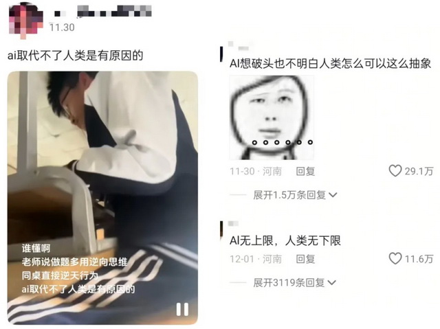 但每当有博主拍出比AI更加逆天的剧情时,就会有“AI终究还是取代不了人类”的评论出现。毕竟,AI是基于过去经验的推理,而人类如果执意“抽象”,总可以比AI做得更加不合逻辑、不可理喻。