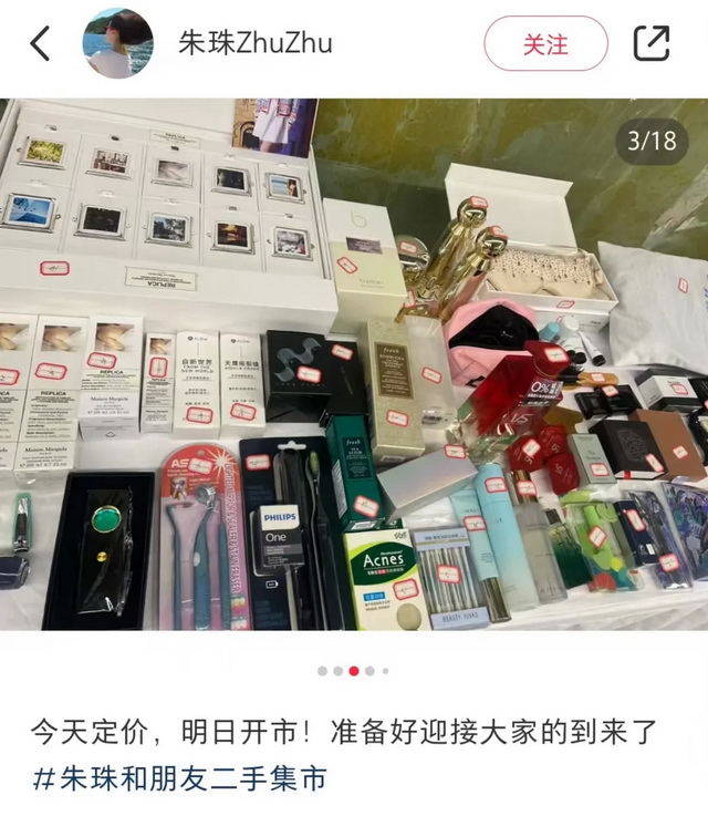 早在今年五一,演员朱珠就在小红书发布笔记,为自己的“二手市集”吆喝,称将在北京798举办“朱珠和她的朋友们”环保绿色集市,联合朋友们拿出包括衣服、首饰、鞋包、护肤化妆品、母婴产品、艺术衍生品、生活用品在内的上千件物品,来到现场进行售卖。