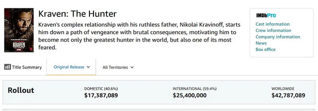 《猎人克莱文》票房(图源:BoxOfficeMojo)