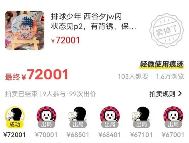 “谷子”,音译自“Goods”,在经历日文转译后与原本“货品”的含义产生偏移,意指部分二次元周边,如“吧唧”指的是badge徽章;“透卡”是印着动漫人物的透明卡片等等。一块《排球少年》角色的吧唧在二手平台上被炒到了7.2万元,传说中这款吧唧全球限量5枚。