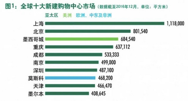 同样在这一年,中国商业地产投资增速超35%,中国本土商业地产开发商开始发力,如万达、龙湖等企业,在这一年开出首个商业项目。之后,我国商业地产开发投资额也保持规模绝对增长,截至2016年,中国在建购物中心面积几乎占全球一半,而这一记录保持了近6年。