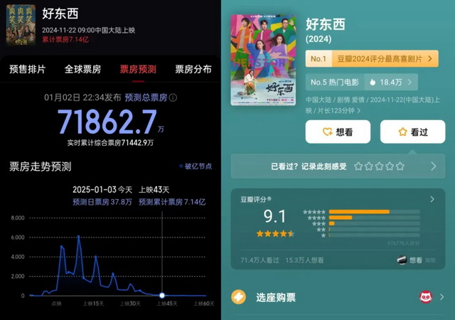 比如邵艺辉的《好东西》在两轮点映之后,凭借着口碑一路逆袭,预测票房从起初的1亿涨至7亿,且豆瓣评分开分9.1分,创下2024年国产片开分最高剧情片纪录。邵艺辉凭借《好东西》出色的表现赢得观众的喜欢,在有好戏观众选择中,收获大满贯,摘下最佳电影、最佳导演、最佳编剧三项荣誉。