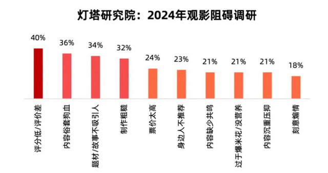 根据灯塔《2024中国电影市场年度盘点报告》显示,当下消极口碑是观影的第一阻碍,占40%。而2024年未购票评论占比同比去年上涨了3%,这意味着场外评论的声音影响进一步提升。