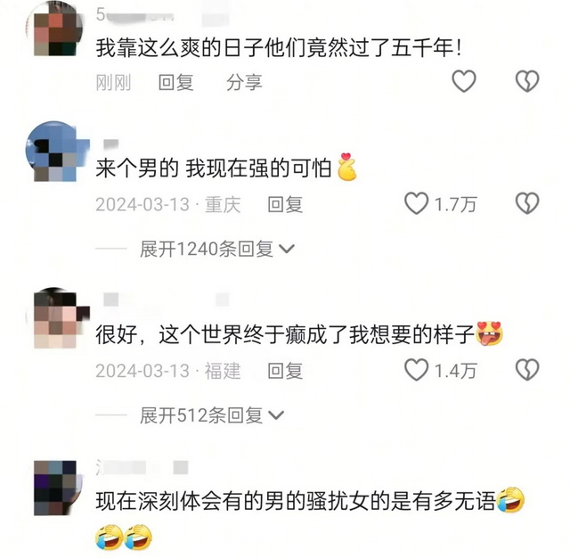这样的一支视频,引起了不少网友热议。有人在评论里说“现在给我个男人我强的很”,有人则看透了视频的反讽意味,说“现实生活中男生这种行为确实很讨厌但又没办法”,在@阿喵(福建第一内向)的视频里有种“敢怒敢言”的快感。