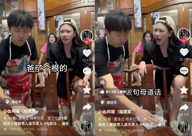 在这些视频中,女人们模拟着现实生活中男人的样子,抽着棉签当抽烟、拍着自己的大肚子,再提提松垮的腰带,指着站在角落里低眉顺眼的男人,一口一个“生不出女儿就滚回你爹家去”“爸的,穿得水性杨草的给谁看?”
