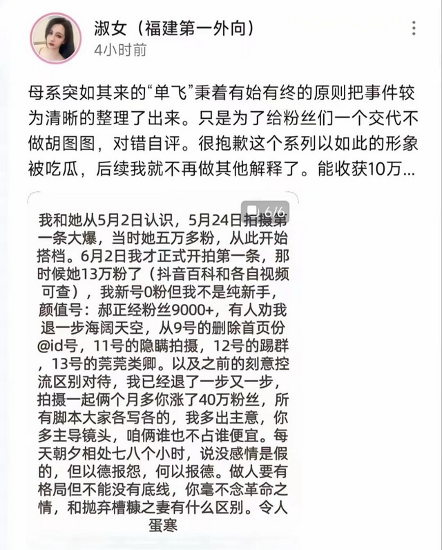 但好景不长,随着视频流量逐渐走高,@阿喵(福建第一内向)和另一位女性合拍博主@淑女(福建第一外向)出现缝隙,@阿喵(福建第一内向)先是在个人简介中将其他合拍演员账号全部删除,只留了自己的小号介绍。