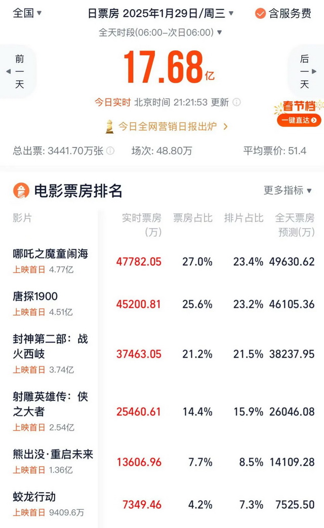 不要诧异于电影市场的红火,因为今天是中国电影历史上票房最高的一天。截至毒眸发稿前,大年初一的单日票房已经达到了17.91亿,总人次达3490万,还在继续冲击更高的数字。此前的单日票房纪录来自于2021年的大年初一,仅16.93亿,这一数字在今天的19:17就已经被打破。若与去年大年初一的13.47亿对比,这一数字在今天下午13:50左右便已经被超越,今日的最终预估票房将同比上升35%左右。