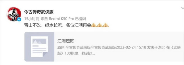 预言的危机逐渐被确定。曾以“为国为民,侠之大者”为创刊理念的中国大陆第一本武侠文学期刊《今古传奇·武侠版》,经历着十多载发行量锐减,勉力坚持到2023年,最终正式宣布停刊。