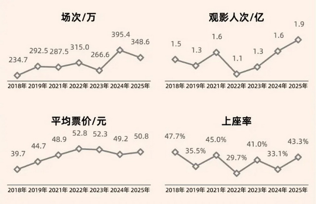 95.1亿的票房与1.87亿的总人次,无悬念地双双创下春节档的新高,票房同比实现了18.6%的增长。场次数仅348.6万,比去年少了20万场左右,但鉴于去年档期多一天,实际日均场次实现了4.3%的增长。上座率也相当可观,据灯塔,2025年春节档整体上座率为43.3%,比去年高出了10%左右。