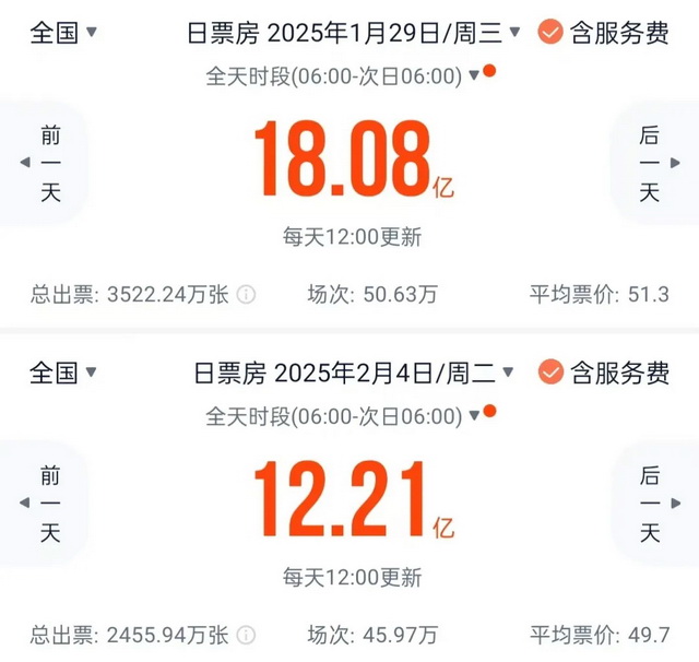如果细分到单日票房上,今年春节档的表现更加夸张,往年的顶尖成绩在今年只道是寻常。整个春节先是以大年初一的18亿超高开局奠定基调,此后的逐日跌幅相当微弱,直到假期的最后一天单日票房仍保持在12亿以上。这是什么概念?去年从初二开始便已经跌至10.58亿,甚至除了2021年之外,没有任何一年的春节档在大年初一之外能录得12亿以上票房。