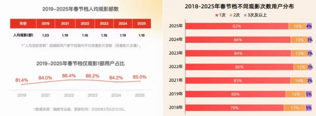 有趣的是,人均观影频次的数据,在灯塔与猫眼的报告中出现了较大分歧。春节档中仅看一部的用户占比,据猫眼统计为85%,比去年有所提升,而据灯塔统计为82%,比去年有所下降。