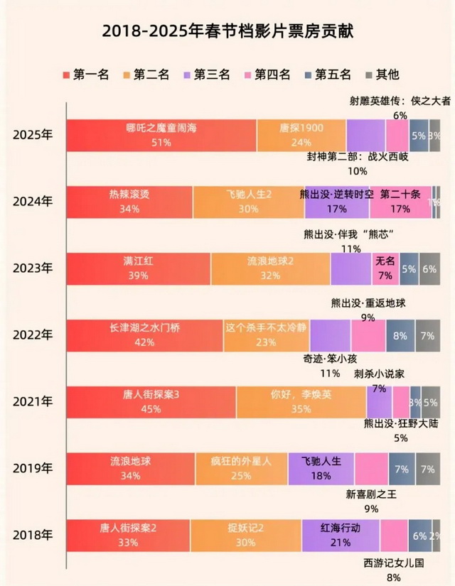 得此佳绩,最大功臣非《哪吒之魔童闹海》(以下简称《哪吒》)莫属。《哪吒》单片收获了春节档51%的票房,这是此前从未出现过的比重。如果说往年的春节档是“双强争霸”或“三足鼎立”,那么今年的春节档完全算得上“一家独大”。