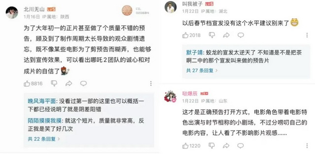 但即便在观众大年初一试菜之前,从营销的角度,《哪吒》就已经给不少观众留下好印象,使得《哪吒》从第一步开始就走得稳扎稳打。《哪吒》初期释放的物料,在各大社交平台收获的路人好评便显著高于其他几部影片。