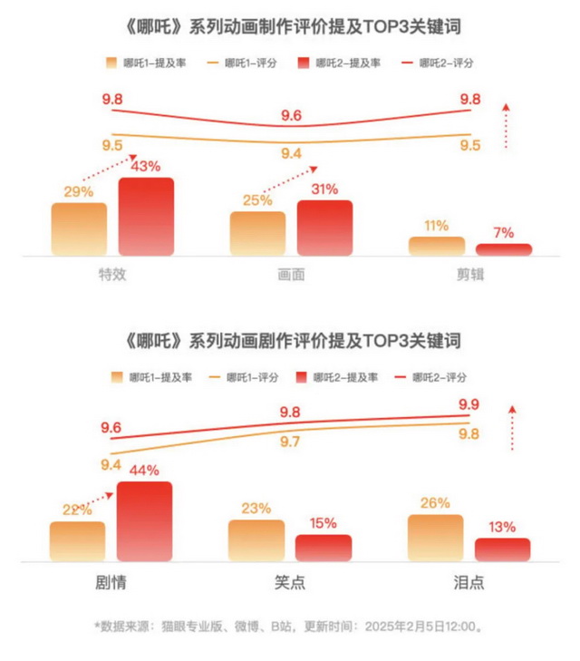 最后,最本质的因素在于,《哪吒》在制作层面和剧作层面均得到了大众认可。据猫眼《2025春节档数据洞察》,《哪吒2》制作评价较前作大幅提升,特效及画面呈现的评分也高于前作,剧作层面剧情的提及率较前作翻倍,且剧情、笑点、泪点的评分均高于前作。