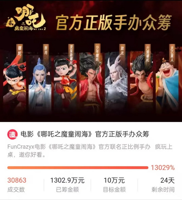 观众对电影的热情可以被转化为票房以外的很多数字。比如随着《哪吒》的票房走高,其衍生品售卖情况同样火爆。比如《哪吒》与FunCrazy的官方正版手办众筹项目,目前已经众筹1300万元,目标达成率为130%,与泡泡玛特推出的联名盲盒目前处于脱销状态,在二手市场交易价格几乎翻倍。