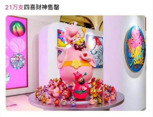 除了基于影片的衍生收入,也有基于影院的衍生收入。比如春节期间万达影城内,亮相了27家全新的艺术商店,它们和706家万达电影直营院线一起,创造了2600余万的衍生品GMV。其中,最炙手可热的文创产品“四喜财神”,用时七天,即宣告21万支全部售罄。十种全新口味的爆米花,也累计售出超220万桶。