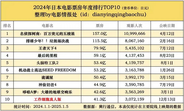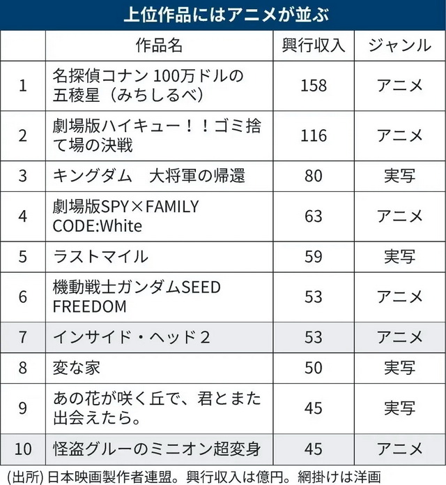 去年撑起影市脊梁的主力军依然是剧场版动画。1月底,《机动战士高达SEED FREEDOM》率先激活大银幕,院线总收益达到53.8亿日元,接棒前年12月公映的《间谍过家家代号:白》。2月中旬,《排球少年!!垃圾场决战》又刮起一股运动旋风,首周前三天以22.3亿日元登顶,打破由《灌篮高手》保持的体育剧场版开画纪录,最终长线续航至116.4亿日元,成为去年首部突破百亿关口的本土电影。来到4月,《名侦探柯南:百万美元的五棱星》接力出击,首周末便以33.52亿日元创下影史次高纪录,累计票房更飙升至158亿日元,在历年排行榜上居第14名,离身前的《阿凡达》(159亿)仅一步之遥。
