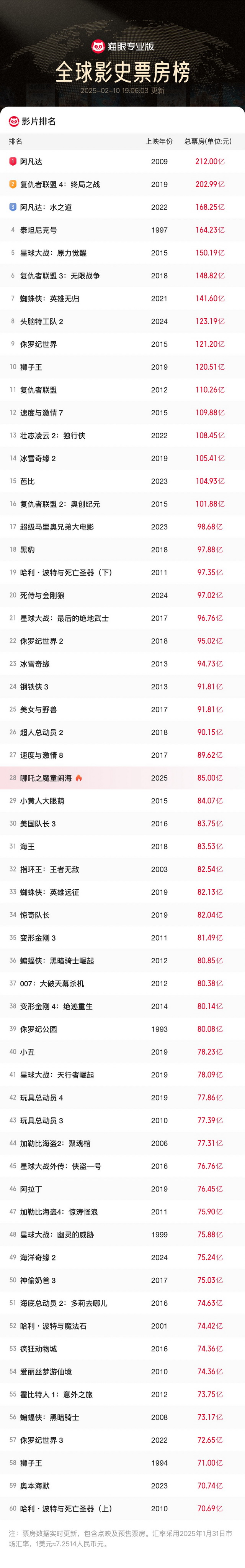 据猫眼专业版数据,《哪吒之魔童闹海》累计票房(含预售)破 85.00 亿元,超《小黄人大眼萌》票房成绩,进入全球动画电影票房榜前 6,全球影史票房榜前28,也是全球票房 TOP30 影片唯一非好莱坞影片。