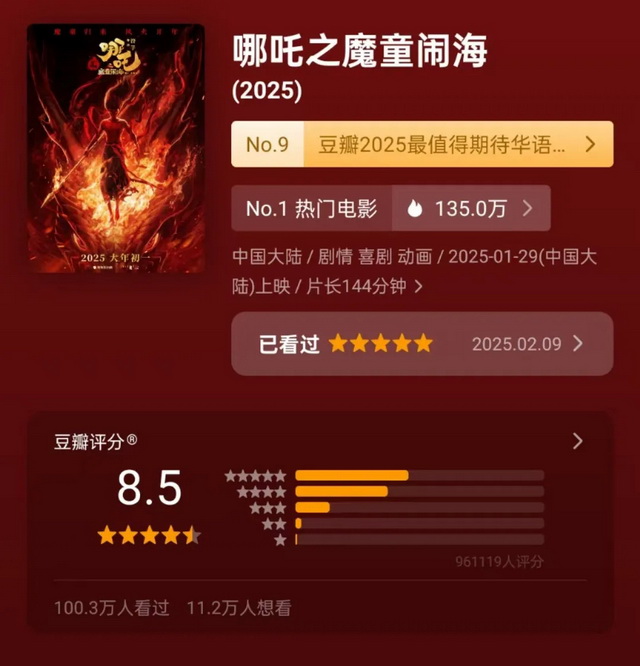 但口碑评分却是一个具备确定性的数字——100万人为《哪吒2》打出了8.5的豆瓣评分,创下了近十年春节档票冠最高分纪录。