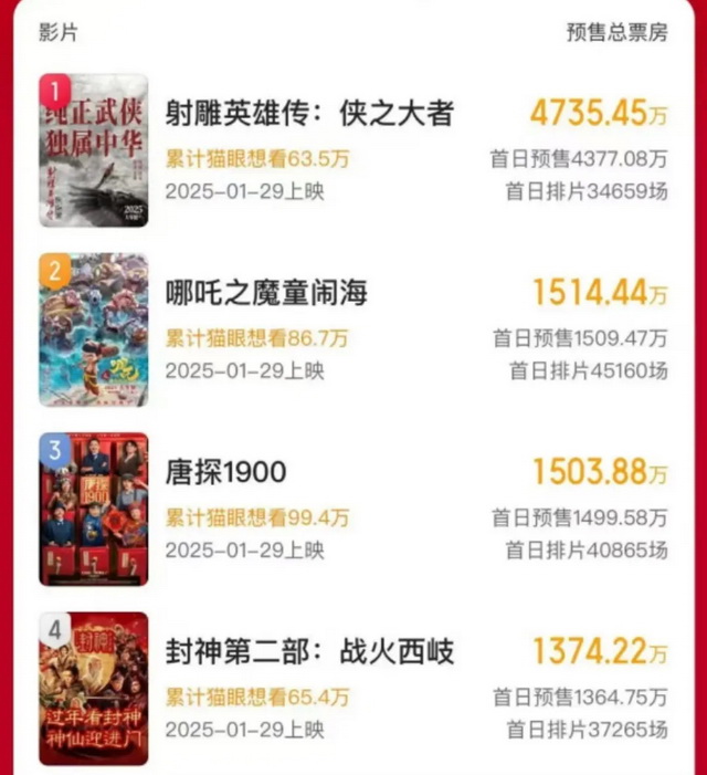 映前阶段,《哪吒2》的动作稍显保守,预告片并没有放出太多有效信息,春节档的特殊性也让它无法像第一部一样通过点映来释出口碑风向,这样很难让观众在初期对成片质量建立信心。因此,预售阶段《哪吒2》的前期优势并不明朗,与《唐探1900》《封神第二部:战火西岐》没有拉开较大距离。