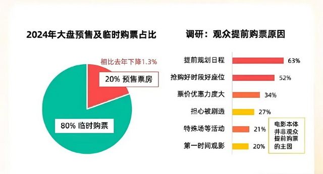 预售阶段的“养精蓄锐”,很大一部分原因基于市场环境的变化做出的策略调整。毒眸在往期的档期复盘和年度盘点中就频繁提到,疫情之后,观众的购票决策明显后置,预售阶段不再能“一决胜负”。据灯塔报告,2024年全年电影市场预售积极性持续下降,临时购票占比80%。