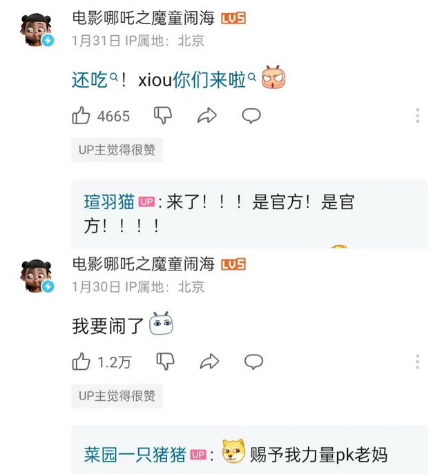 《哪吒2》的B站官方账号也下场参与进来,潜入各个UP主评论区整活儿互动。跟着UP主瑄羽猫有模有样地学起了天津话;“助攻”UP主菜园一只猪猪的哪吒COS。评论区下方,有不少观众也“凑热闹”地“捞”官方,一起玩梗互娱。正是这种真实、有趣的社区氛围,吸引了不少年轻人的加入与关注。