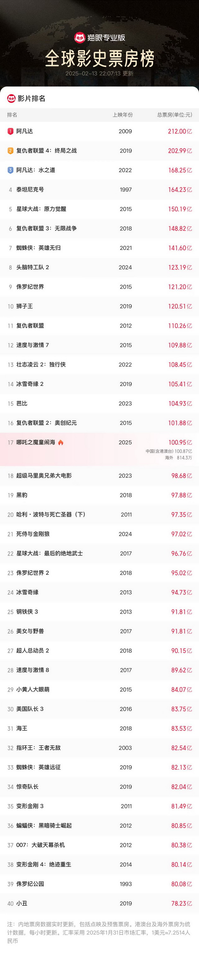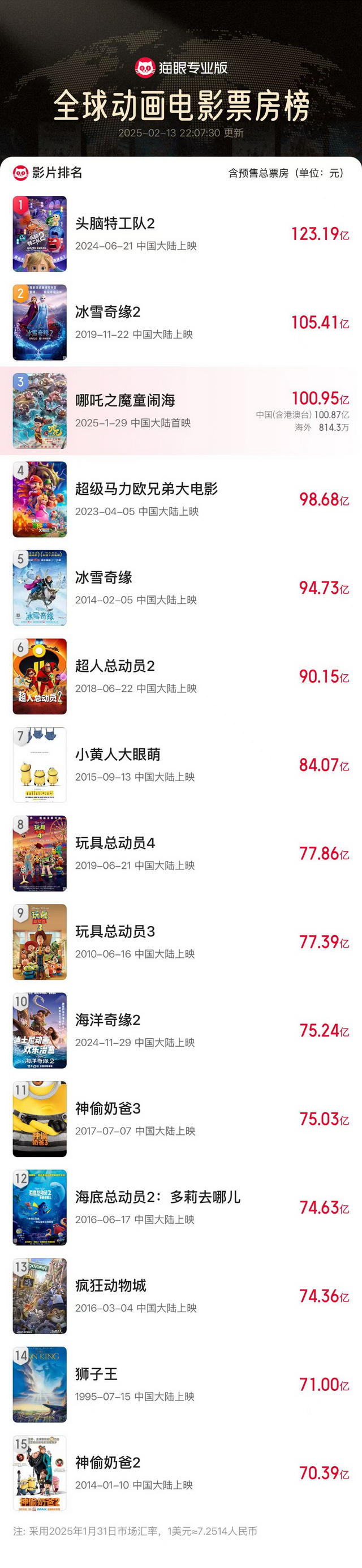 据猫眼专业版数据,截至2月13日22时7分,影片《哪吒之魔童闹海》总票房(含预售)100.95亿元人民币,超过《超级马里奥兄弟大电影》,进入全球影史票房榜前17名,全球动画电影票房榜前3名。这不仅是一部电影的成功,更是中国动画电影的崛起。我们期待着中国动画电影在未来能够创造出更多的辉煌,为观众们带来更多的惊喜。