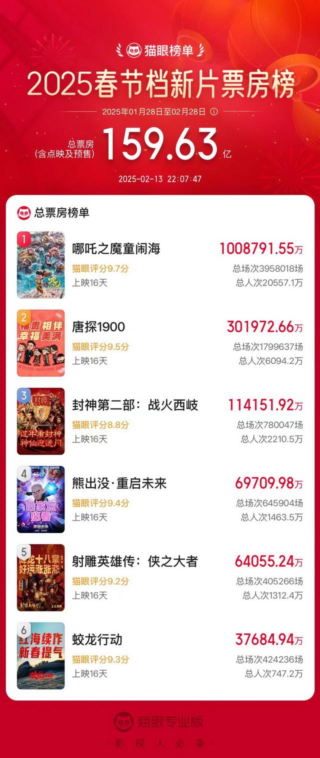 “160亿”,猫眼专业版对《哪吒之魔童闹海》(以下简称《哪吒2》)的最终票房预测已经上升到了一个前所未见的数字上。而这才是上映的第16天,难以想象,《哪吒2》最终会以怎样的数字收尾。