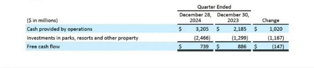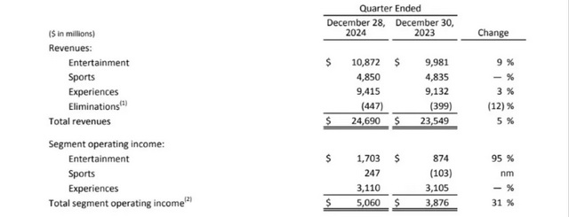 2月5日,迪士尼发布截至2024年12月28日的季度财报。在该季度中,迪士尼的总收入为246.90亿美元,相较前年录得的235.49亿,同比增长近5%;所得税前收入则上涨27%至36.6亿美元,推动稀释后每股收益从1.04美元升至1.40美元。