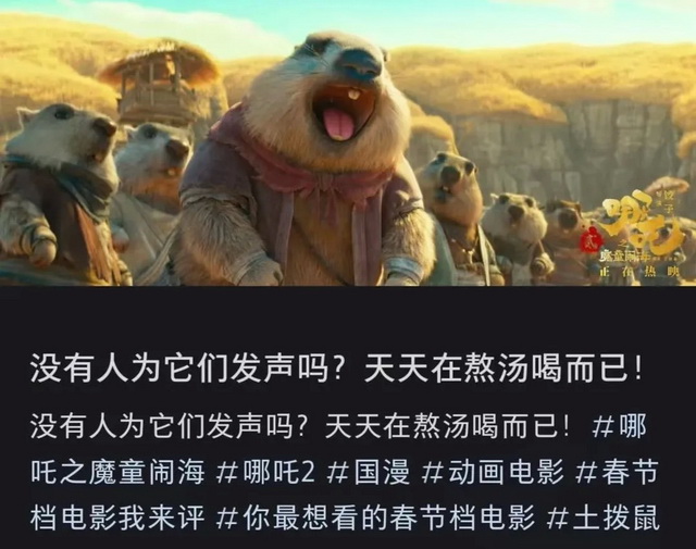 更别提《哪吒之魔童闹海》中极其丰富的人物群像,简直就是二创与玩梗的乐土。除了主角“藕饼”之外,影片对于很多小角色的塑造给观众留下了深刻记忆点:“没惹任何人”的土拨鼠、最“意难平”的申小豹、适合作为“小手办”的石矶娘娘,都成为了小红书上讨论的重点,也是支撑很多观众二刷的理由。