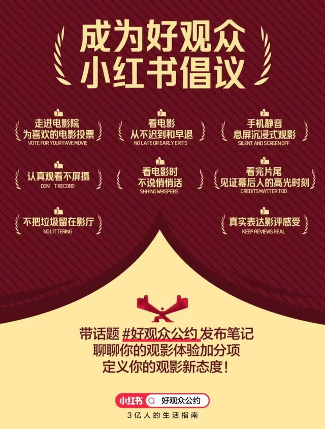 争吵无法形成真正的“沟通”,与其用约束的方式,倒不如让有号召力的人来倡导。于是,在今年春节档开始之前,小红书就联合制片人协会与导演协会、电影频道、春节档6部电影的片方一起提出“好观众公约”的概念,并由主演或主创拍摄公益短片。