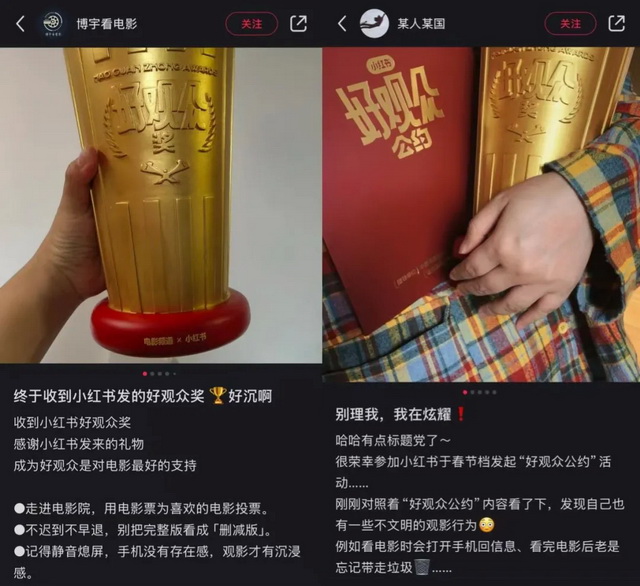 这无疑是一项非常有先见之明的举措。如果用户在春节期间参与小红书官方的影评活动,还有机会亲手领到“好观众奖”,用颁奖的方式来鼓励观众维持包括不屏摄在内的文明观影行为。观众的重要性由此得到了强调,不论是观影礼仪还是映后的讨论,小红书的“好观众公约”都将观众当成了“自己人”。比起硬性约束,这样的良性倡导对于普通观众而言显然接受度更高,许多用户争相发笔记晒出自己奖杯的同时,也进一步向外科普了文明观影守则,实现了真正的“沟通”。