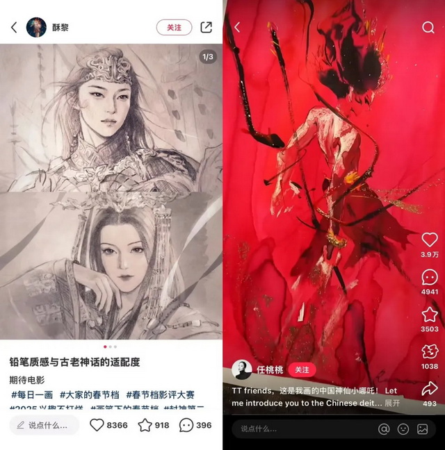 图文是小红书的特色生态,正好春节档相关内容产出中,“图”与“文”是最突出的两个赛道。小红书发起的#春节档影评大赛,官方话题浏览量达到了15.3亿,讨论量438.2万,不少关于影片解读的爆款笔记被用户点赞到前排,讨论氛围与电影票房的火热等量齐观。在绘画垂类的联动中,话题#画笔下的春节档也收获了2.3亿浏览与71.1万讨论,小红书用户各出奇招,国画、水彩画、简笔画、素描……二创氛围颇为火热。