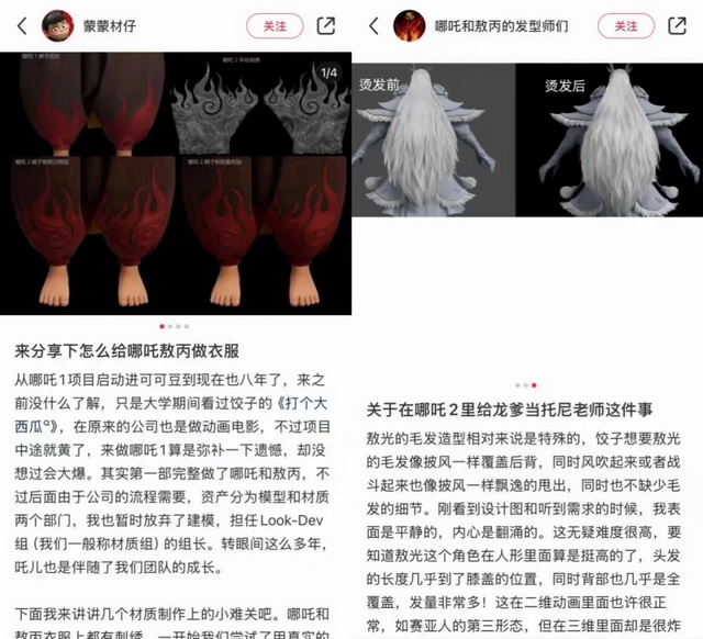 比如用户@蒙蒙材仔是可可豆动画的一员,为《哪吒之魔童闹海》制作服装,在笔记中分享了刺绣的纹理与制作理念。还有敖光的“Tony老师”们,向用户分享敖光一头飘逸的秀发在“烫发”之前与之后的区别。对于观众而言,或许不一定能直观地在大银幕上看出所有细节,但正因主创团队在每一处或可见或不可见的细节上都认真对待,才有机会收获观众的全面认可。
