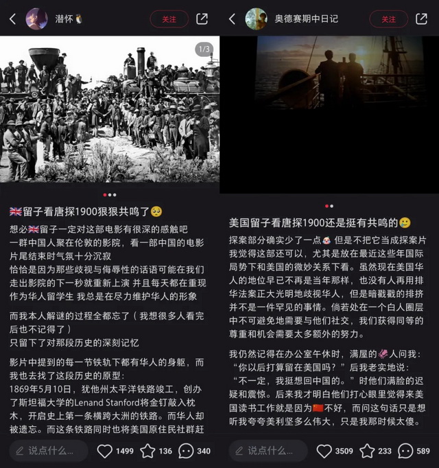 而此次《唐探1900》大规模海外同步发行,这也使得海内外的观众可以在小红书上跨国界、跨时差地进行尽情讨论。尤其,影片展现百年前海外华人的生存困境,引发了不少“留子”的情感共鸣。毕竟,对身处国内的观众来说这或许只是段历史,但对于漂泊海外的同胞来说,却可能是一种现实。