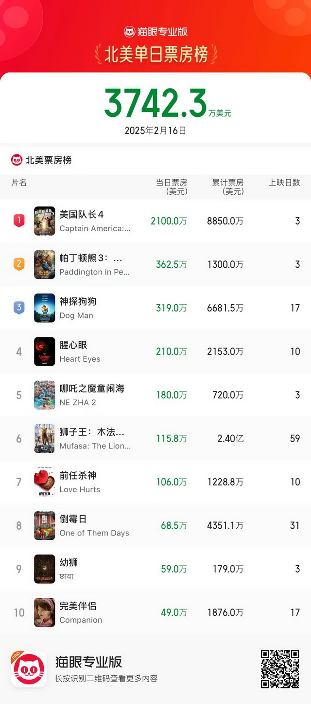 以下为猫眼专业版统计的北美票房数据,《哪吒之魔童闹海》北美上映 3 天,累计票房 720 万美元(约 5229 万元人民币)。