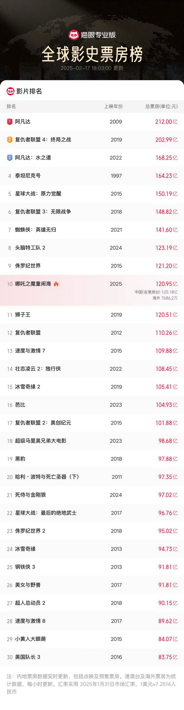 以下为全球影史票房榜,《哪吒之魔童闹海》即将超越排名第 9 的《侏罗纪世界》。