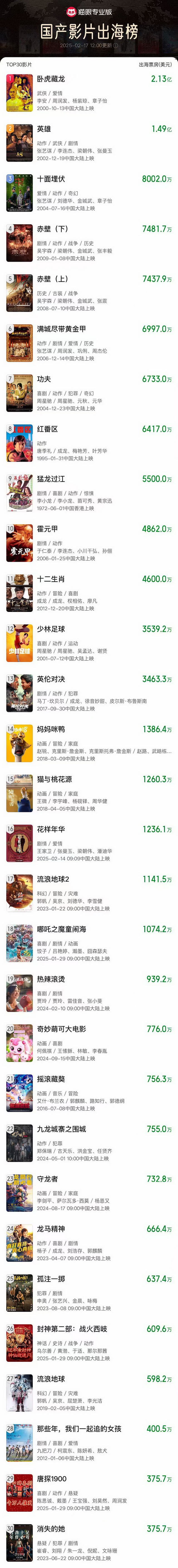以下为国产影片出海榜,《哪吒之魔童闹海》当前位列第 18 名,出海总票房 1074.2 万美元(当前约 7801 万元人民币)。