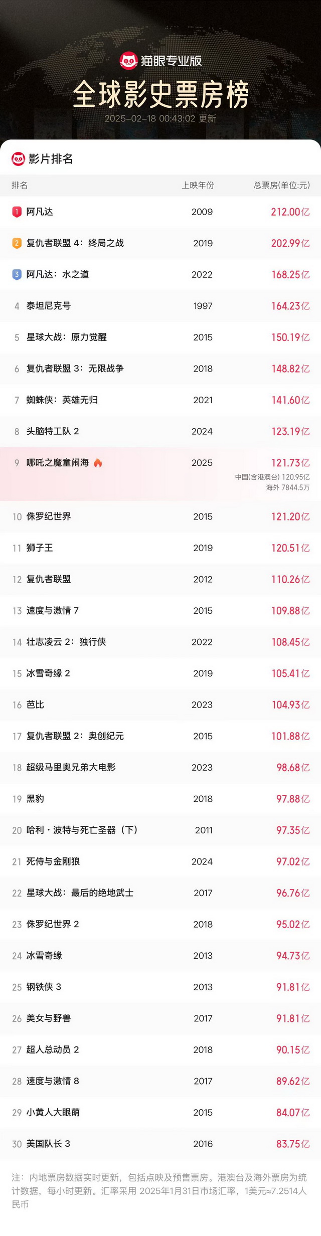 据猫眼专业版数据,截至2月18日0时43分,影片《哪吒之魔童闹海》总票房(含预售)121.73亿元人民币,超过《侏罗纪世界》,进入全球影史票房榜前9名,全球动画电影票房榜前2名,距离全球动画电影票房榜第一名的《头脑特工队2》仅差1.46亿。