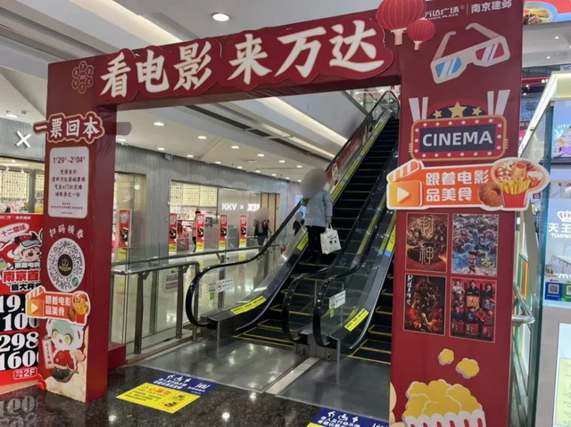 步入南京建邺万达广场,扶梯口架起的“红包墙”吸引着来来往往的商场顾客驻足。这是商场四楼的万达影城为了今年春节档特地制作的活动物料,硕大的活动二维码指向了万达影城今年推出的“一票回本”活动——顾客扫码领取券包,凭借票根可去往餐饮商铺享受折扣或者小食品尝机会。