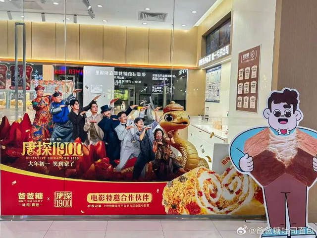 在春节档电影《唐探1900》的宣发合作中,陪伴观众十年的“唐探IP”与各个品牌进行了深入的联名合作。比如,电影主演与安慕希进行了广告合作推送,形成深度合作绑定,“唐探IP”还与爸爸糖、和府捞面等诸多餐饮品牌建立了全国线下主题店、线上联合营销等精彩纷呈的定制合作。