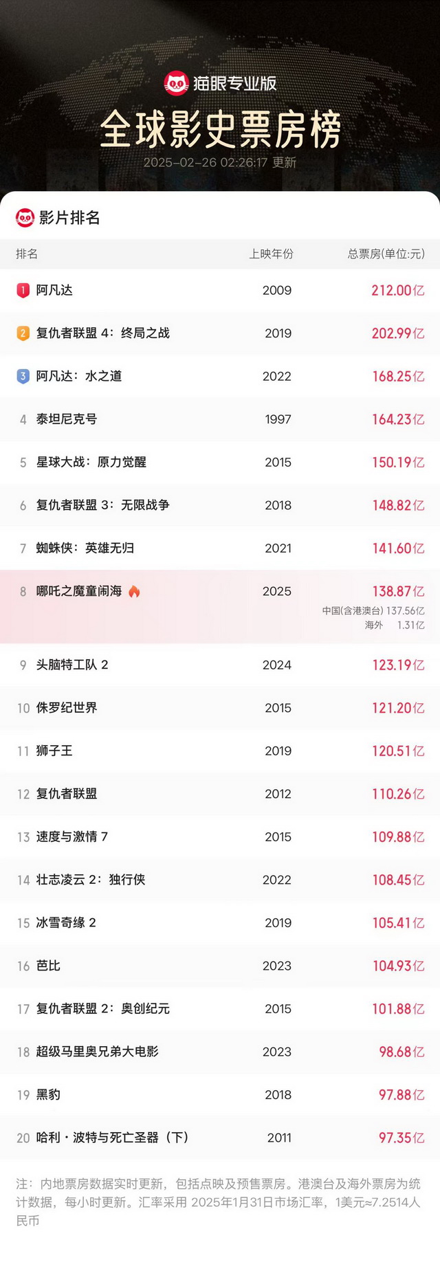 据猫眼专业版数据,截至2月26日2时26分,影片《哪吒之魔童闹海》总票房(含预售)138.87亿元人民币,其中海外票房1.31亿,即将超过《蜘蛛侠:英雄无归》,进入全球影史票房榜前7名。