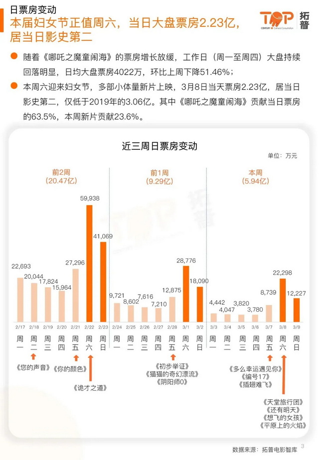 总票房看上去是在破纪录,但一片独大,即便上映新片看似不少,也没有出现像去年《周处除三害》一样的黑马继续带动大盘,虽然妇女节档小周末获得了比预期好的成绩,但整体依旧量级太小。
